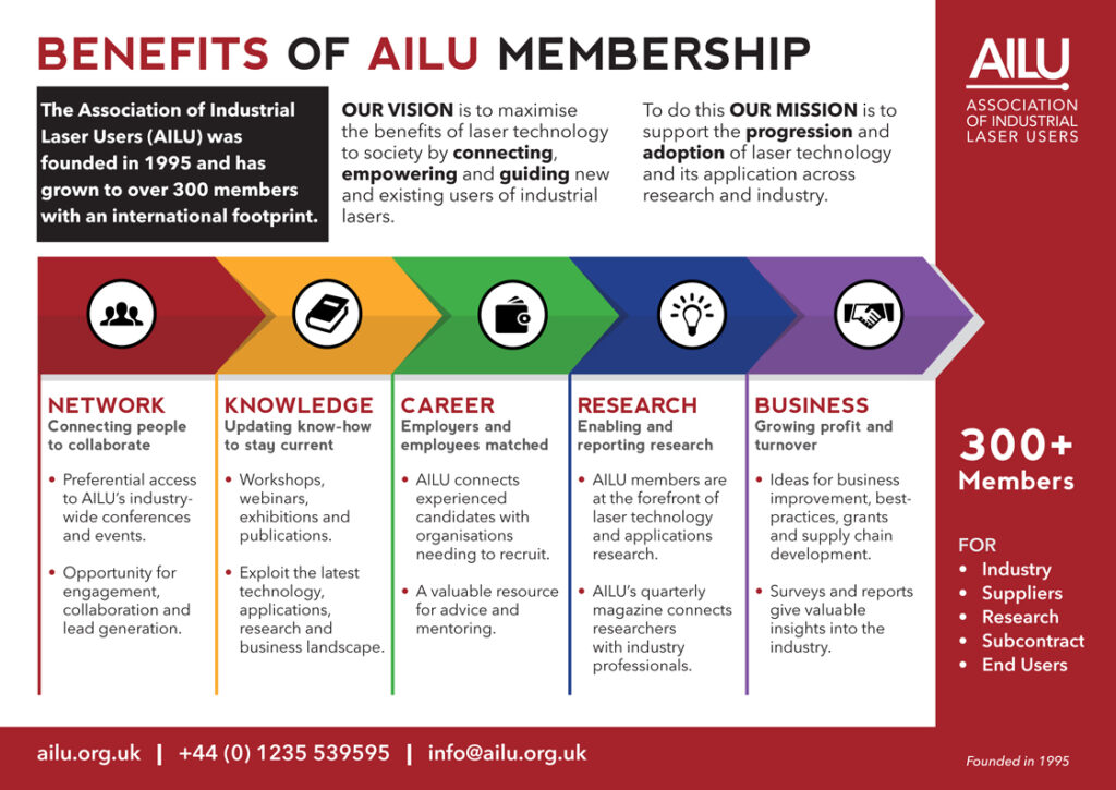 AILU’s membership is a global community of laser users from industry and academia, as well as manufacturers and suppliers of laser-related equipment and services. Although based in the UK a significant proportion of our members come from outside the UK.